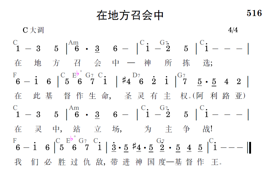 在地方召会中——神所拣选;在此基督作生命,圣灵有主权。(阿利路亚)在灵中,站立场,为主争战!我们必胜过仇敌,带进神国度——基督作王。
