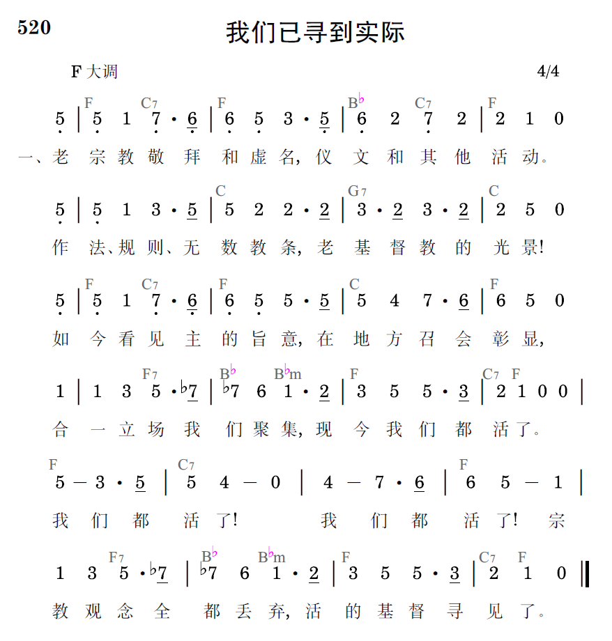 老宗教敬拜和虚名,仪文和其他活动。作法、规则、无数教条,老基督教的光景!如今看见主的旨意,在地方召会彰显,合一立场我们聚集,现今我们都活了。我们都活了!我们都活了!宗教观念全都丢弃,活的基督寻见了。