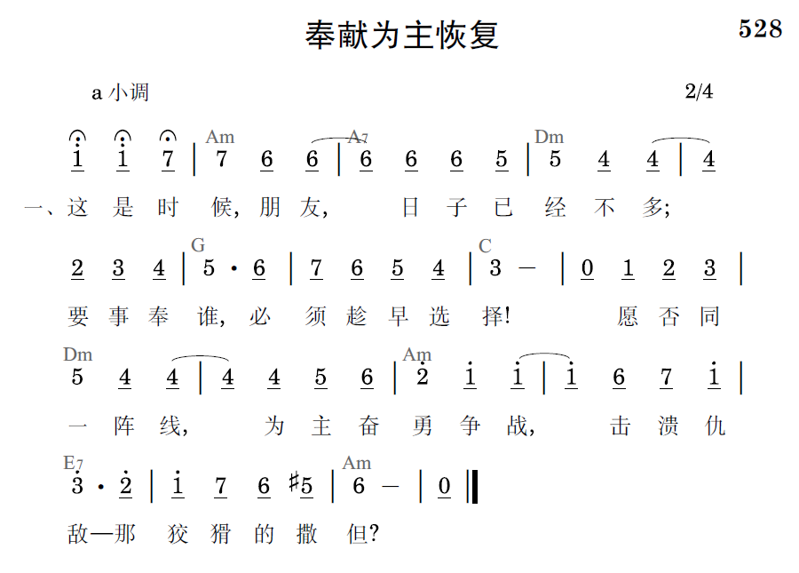 这是时候,朋友,日子已经不多;要事奉谁,必须趁早选择!愿否同一阵线,为主奋勇争战,击溃仇敌——那狡猾的撒但?