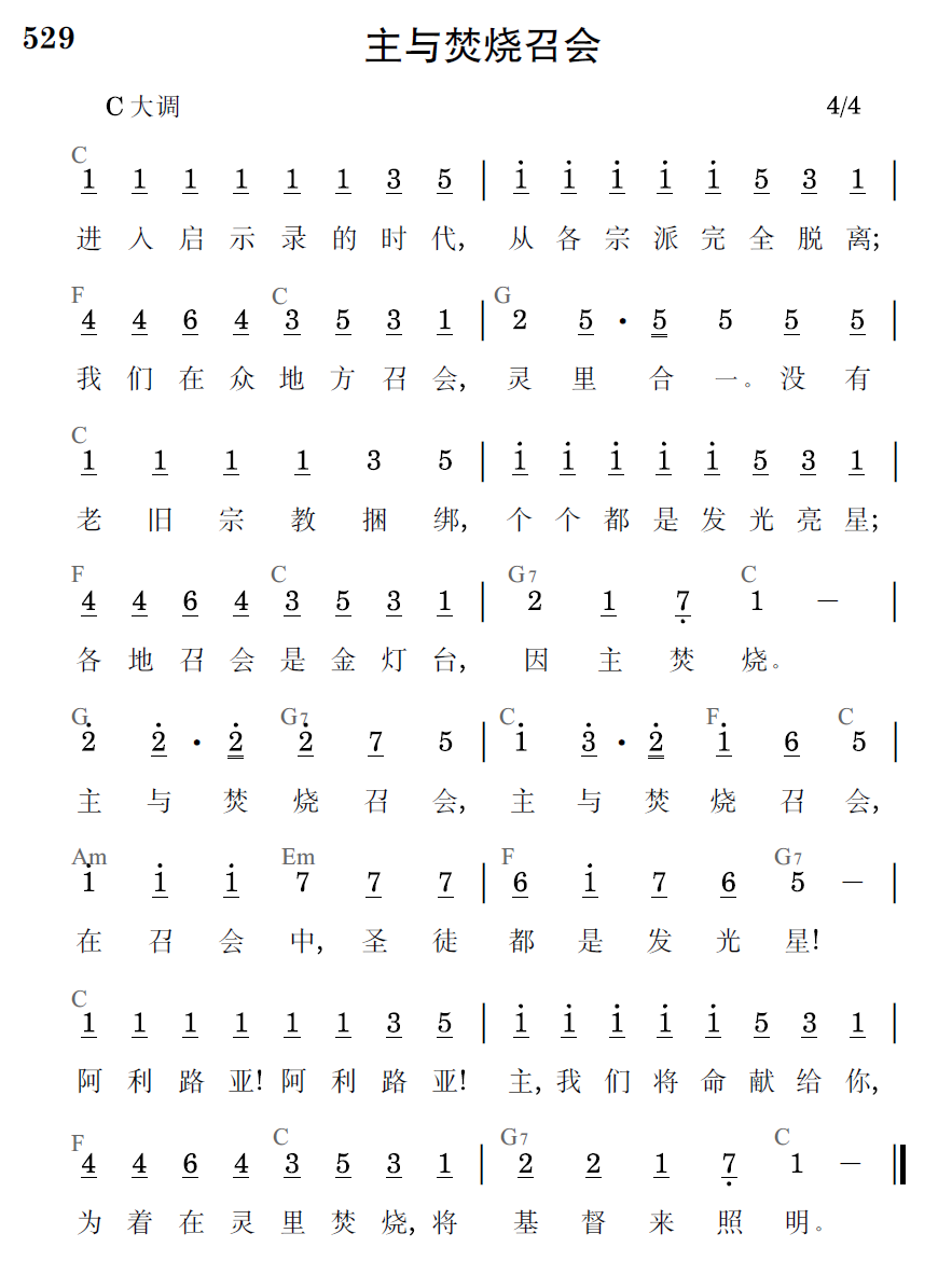进入启示录的时代,从各宗派完全脱离;我们在众地方召会,灵里合一。没有老旧宗教捆绑,个个都是发光亮星;各地召会是金灯台,因主焚烧。主与焚烧召会,主与焚烧召会,在召会中,圣徒都是发光星!阿利路亚!阿利路亚!主,我们将命献给你,为着在灵里焚烧,将基督来照明。