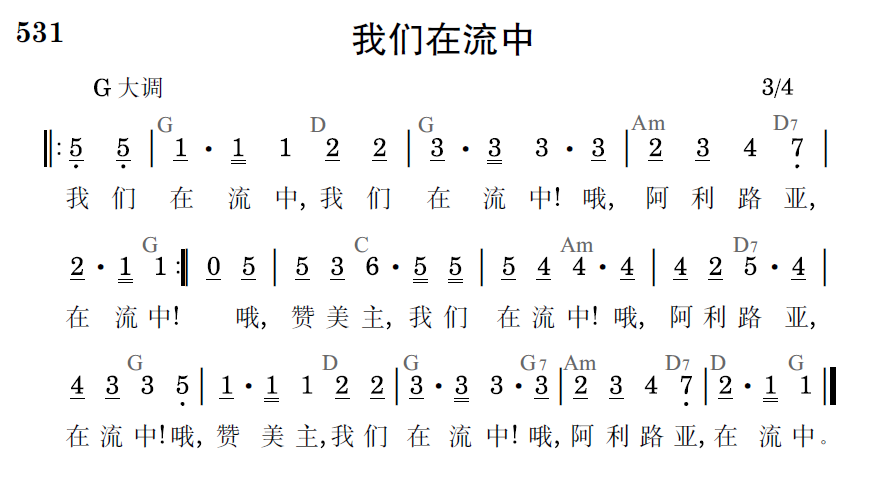 我们在流中,我们在流中!哦,阿利路亚,在流中!(二遍)哦,赞美主,我们在流中!哦,阿利路亚,在流中!哦,赞美主,我们在流中!哦,阿利路亚,在流中。