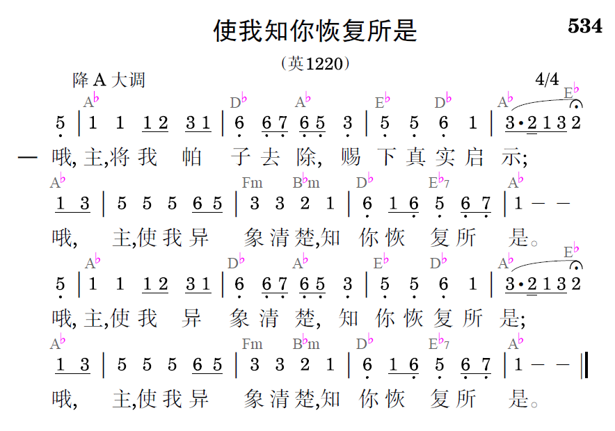 哦主,将我帕子去除,赐下真实启示;哦,主,使我异象清楚,知你恢复所是。哦,主,使我异象清楚,知你恢复所是;哦,主,使我异象清楚,知你恢复所是。