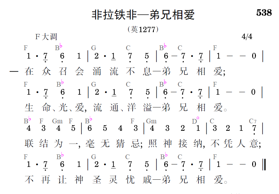 在众召会涌流不息——弟兄相爱;生命、光、爱,流通、洋溢——弟兄相爱。联结为一,毫无猜忌;照神接纳,不凭人意;不在让神圣灵忧戚一弟兄相爱。