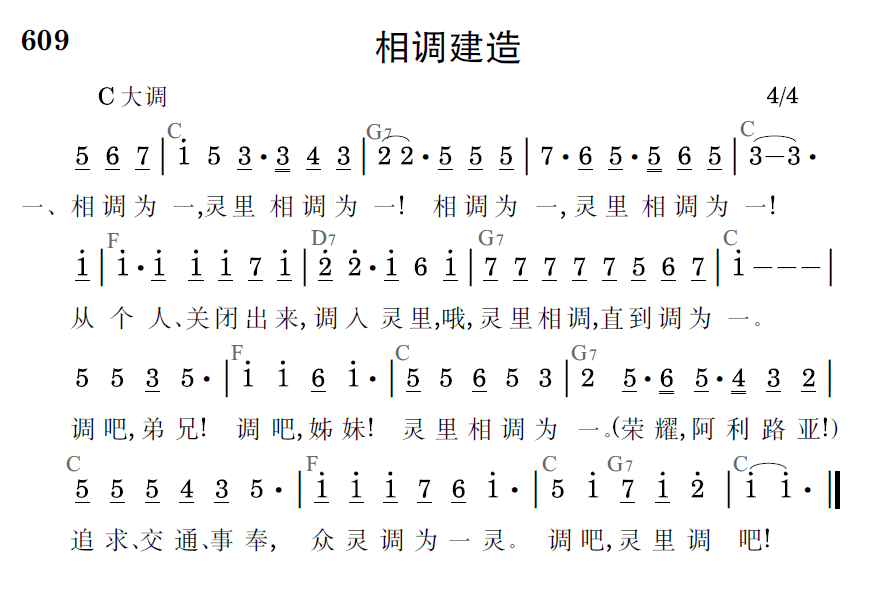 同被建造,爱中同被建造。同被建造,爱中同被建造。要脱离骄傲、不服,同被建造。哦!彼此配搭,一同被建造。建造,弟兄!建造,姊妹!爱中同被建造。(荣耀,阿利路亚!)肢体彼此相顾,长幼互相顺服,爱中同被建造。