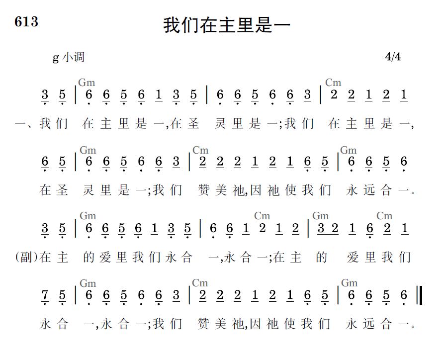 在主的爱里我们永合一,永合一;在主的爱里我们永合一,永合一;我们赞美祂,因祂使我们永远合一。