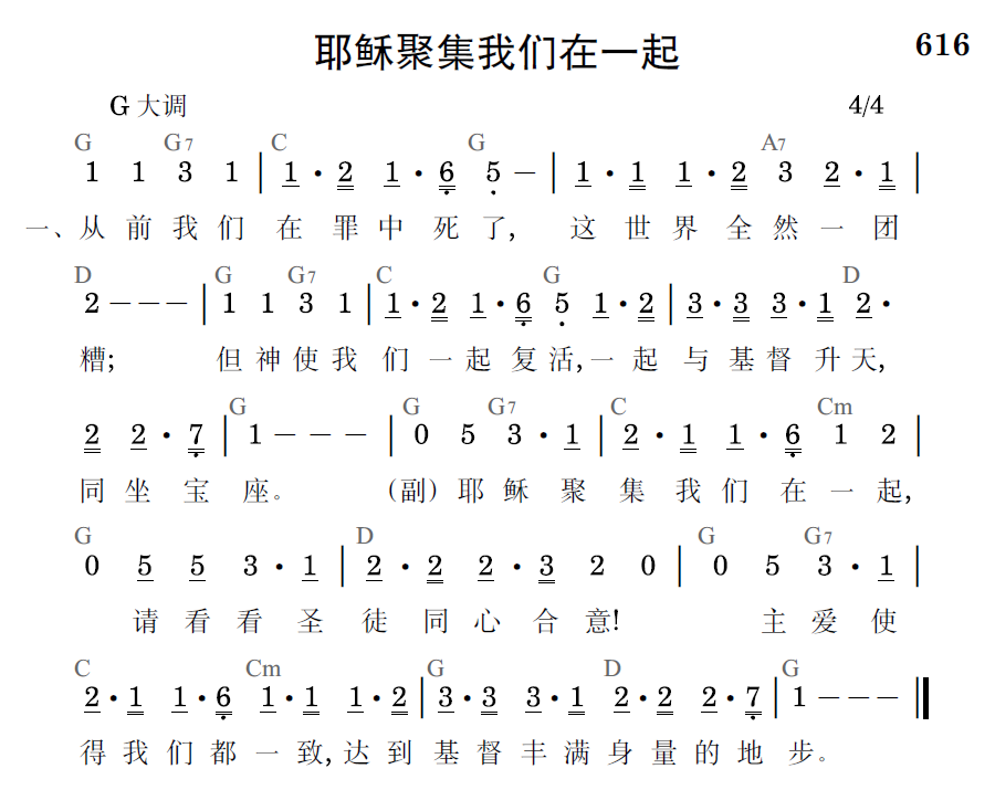 耶稣聚集我们在一起,请看看圣徒同心合意!主爱使得我们都一致,达到基督丰满身量的地步。