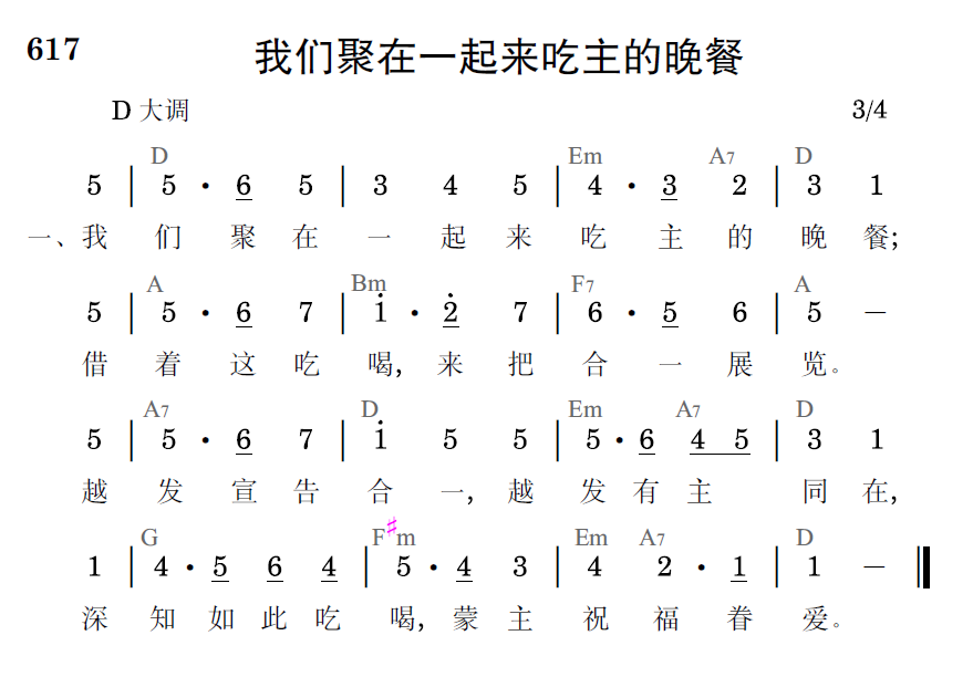 我们聚在一起来吃主的晚餐;借着这吃喝,来把合一展览。越发宣告合一,越发有主同在,深知如此吃喝,蒙主祝福眷爱。