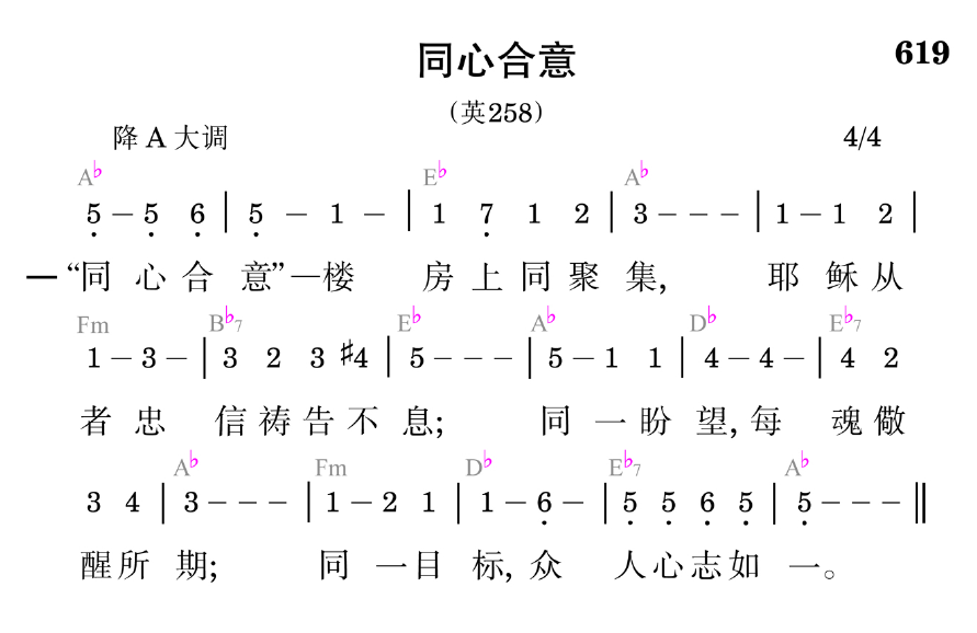 “同心合意”——楼房上同聚集,耶稣从者忠信祷告不息;同一盼望,每魂儆醒所期;同一目标,众人心志如一。