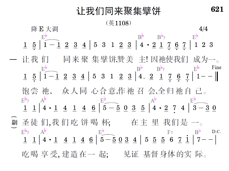 让我们同来聚集擘饼赞美主!因祂使我们成为一。饱尝祂,众人同心合意,作祂召会全归祂自己。