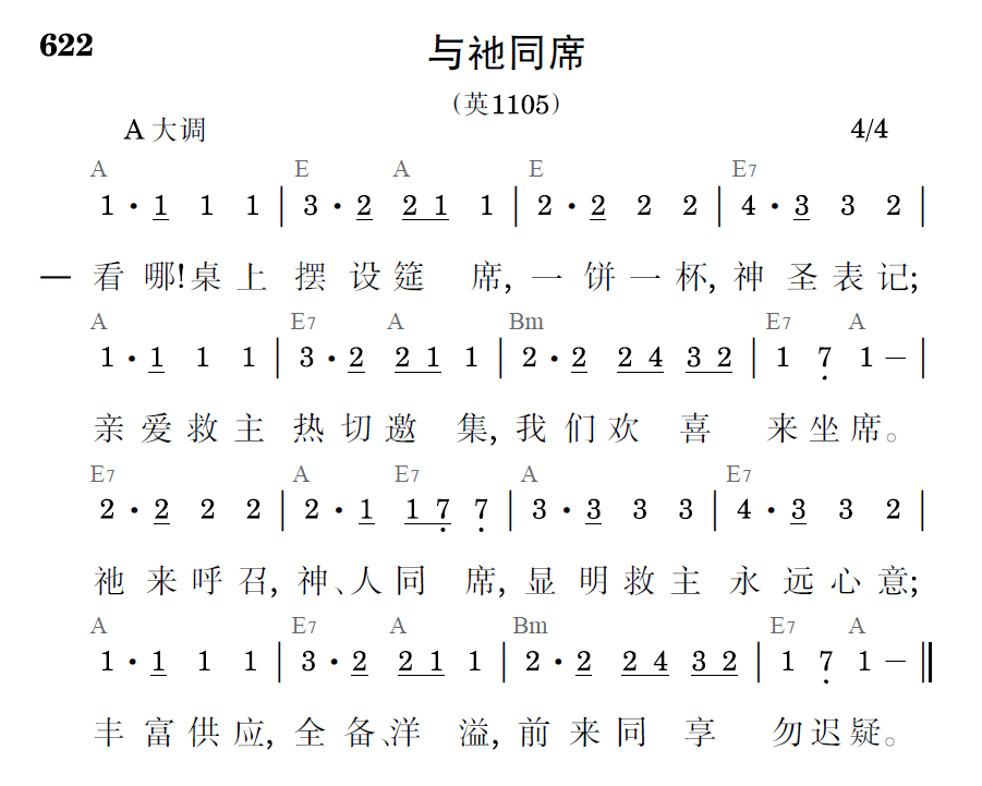 看哪!桌上摆设筵席,一饼一杯,神圣表记;亲爱救主热切邀集,我们欢喜来坐席。祂来呼召,神、人同席,显明救主永远心意;丰富供应,全备、洋溢,前来同享勿迟疑。