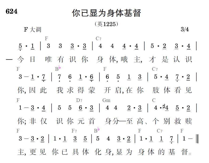 今日唯有识你身体,哦主,才是认识你,因此我求得蒙开启,在你肢体看见你;非仅识你元首身分——至高、个别救赎主,更见你已具体化身,显为身体的基督。