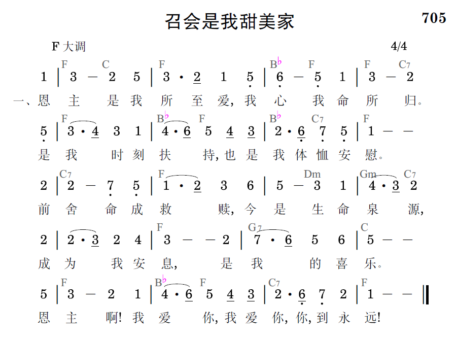 召会是我甜美家,满足我的心怀。是主心爱配偶,也是我终生所投。在这家中有爱,扶持供应无限,使我有力量,引领我前往。召会啊!我爱你,我爱你,你,甜美家!