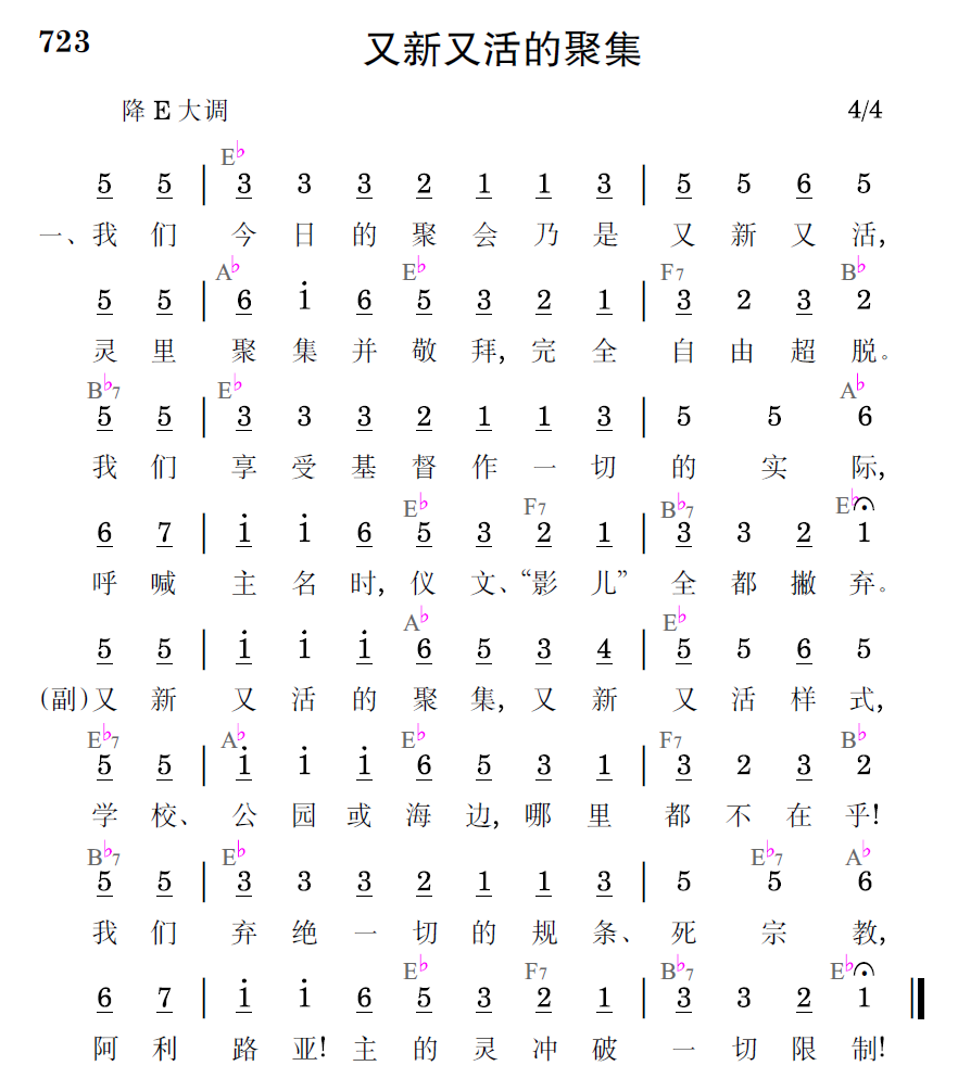 又新又活的聚集,又新又活样式,学校、公园、或海边,那里都不在乎!我们弃绝一切的规条、死宗教,阿利路亚!主的灵冲破一切限制!