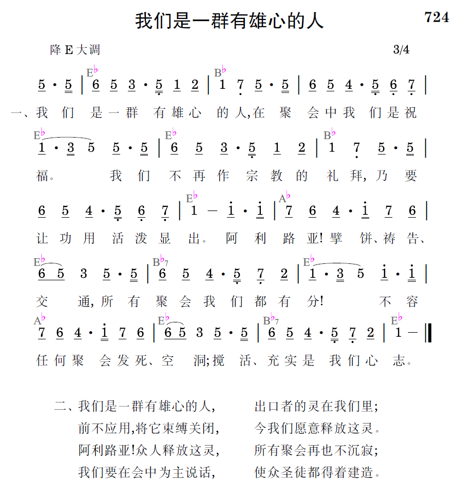 我们是一群有雄心的人,出口者的灵在我们里;前不应用,将它束缚关闭,今我们愿意释放这灵。阿利路亚!众人释放这灵,所有聚会再也不沉寂;我们要在会中为主说话,使众圣徒都得着建造。