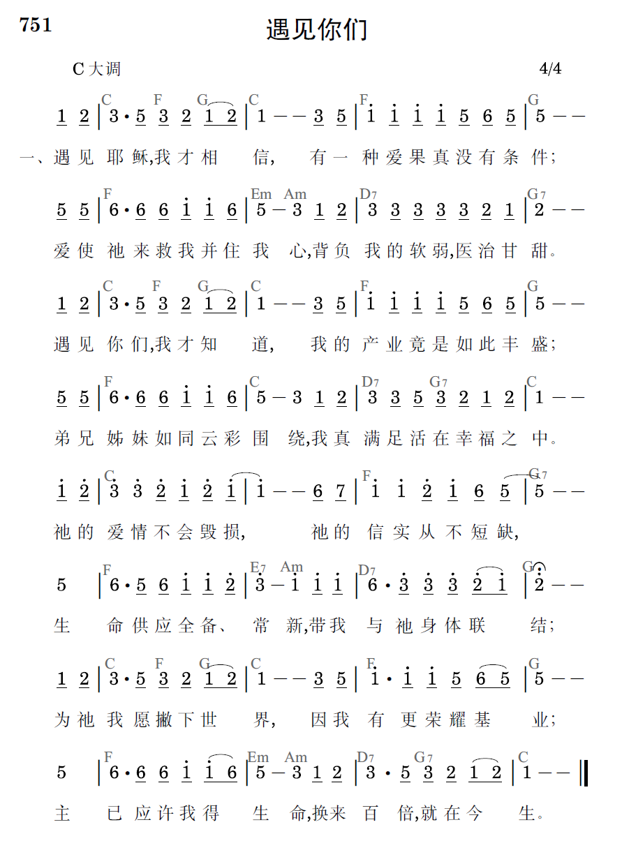 遇见耶稣,我才相信,有一种爱果真没有条件;爱使祂来救我并住我心,背负我的软弱,医治甘甜。遇见你们,我才知道,我的产业竟是如此丰盛;弟兄姊妹如同云彩围绕,我真满足活在幸福之中。祂的爱情不会毁损,祂的信实从不短缺,生命供应全备、常新,带我与祂身体联结;为祂我愿撇下世界,因我有更荣耀基业;主已应许我得生命,换来百倍,就在今生。