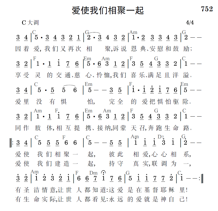 因着爱,我们又再次相聚,诉说恩典、安慰和鼓励;享受灵的交通、慈心、怜恤,我们喜乐、满足且洋溢。爱里没有惧怕,完全的爱把惧怕驱除。同作肢体,相互提携、接纳,同蒙天召,奔跑生命路。爱使我们相聚一起,彼此相爱,心心相系,有圣洁情意,让世人都知道:这爱是在基督耶稣里!爱使我们建造一起,持守真实,联调为一,有生命实际,让世人都看见:永远的爱就是神自己!