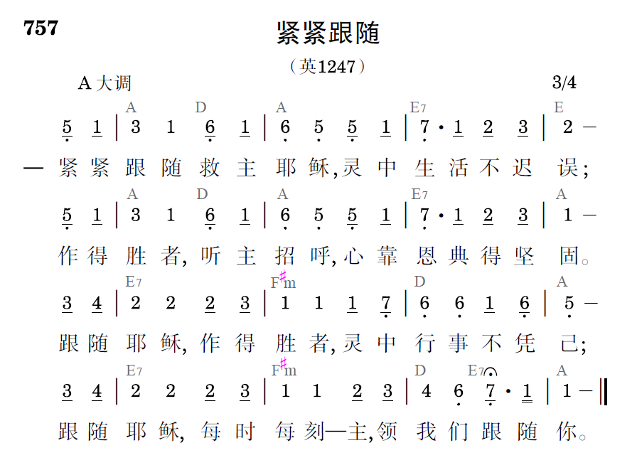 紧紧跟随救主耶稣,灵中生活不迟误;作得胜者,听主招呼,心靠恩典得坚固。跟随耶稣,作得胜者灵中行事不凭己;跟随耶稣,每时每刻——主,领我们跟随你。