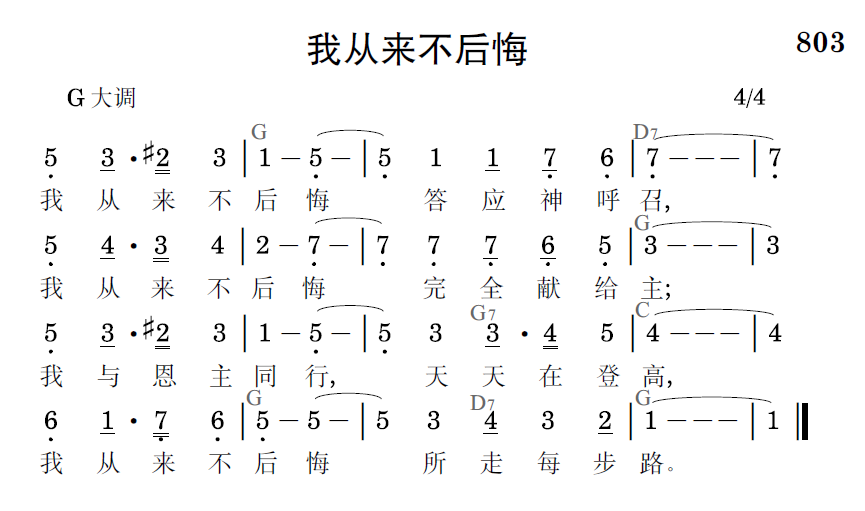 我从来不后悔答应神呼召,我从来不后悔完全献给主;我与恩主同行,天天在登高,我从来不后悔所走每步路。