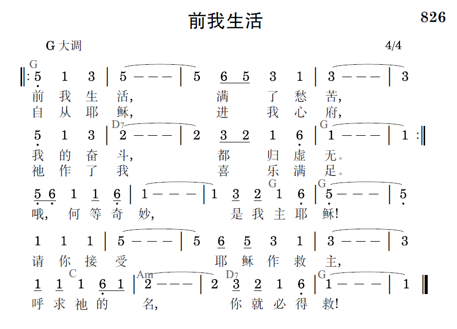 前我生活,满了愁苦,我的奋斗,都归虚无。自从耶稣,进我心府,祂作了我喜乐满足。哦,何等奇妙,是我主耶稣!请你接受耶稣作救主,呼求祂的名,你就必得救!