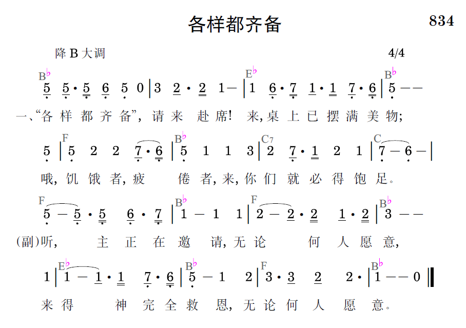 “各样都齐备”,请来赴席!来,桌上已摆满美物;哦,饥饿者,疲倦者,来,你们就必得饱足。