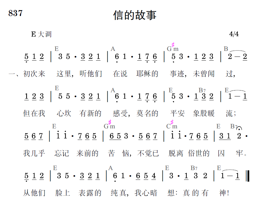 初次来这里,听他们在说耶稣的事迹,未曾闻过,但在我心坎有新的感受,莫名的平安像股暖流;我几乎忘记来前的苦恼,不觉已脱离俗世的囚牢。从他们脸上表露的纯真,我心暗想:真的有神!