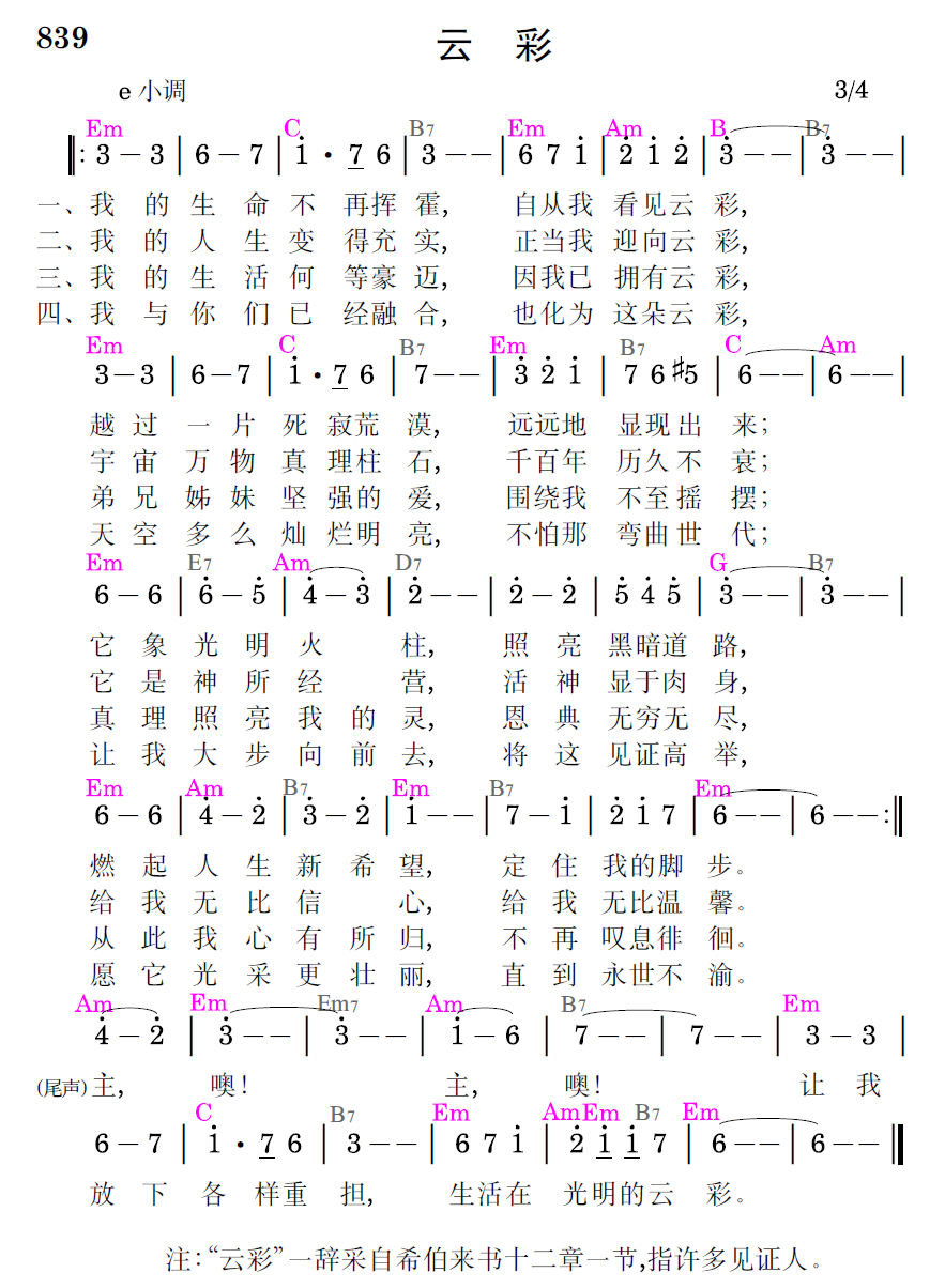 我与你们已经融合,也化为这朵云彩,天空多么灿烂明亮,不怕那弯曲世代;让我大步向前去,将这见证高举,愿它光采更壮丽,直到永世不渝。(尾声)主,噢!主,噢!让我放下各样重担,生活在光明的云彩。