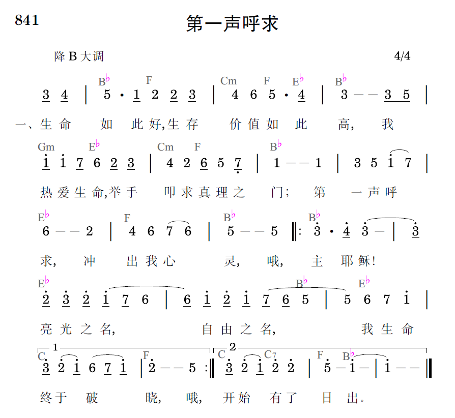 生命如此好,生存价值如此高,我热爱生命,举手叩求真理之门;第一声呼求,冲出我心灵,哦,主耶稣!亮光之名,自由之名,我生命终于破晓,哦,主耶稣!亮光之名,自由之名,我生命开始有了日出。
