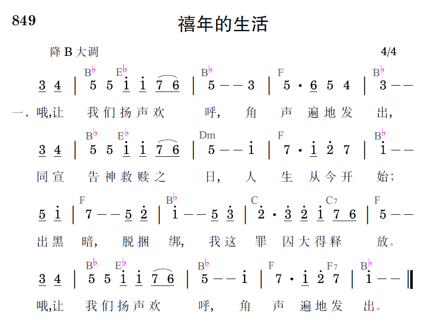 哦,让我们吃喝快乐,父家满了诗歌,祂是我们完全的爱,我们一生年代;来安家神居所,天天过着禧年生活。哦,让我们吃喝快乐,父家满了诗歌。