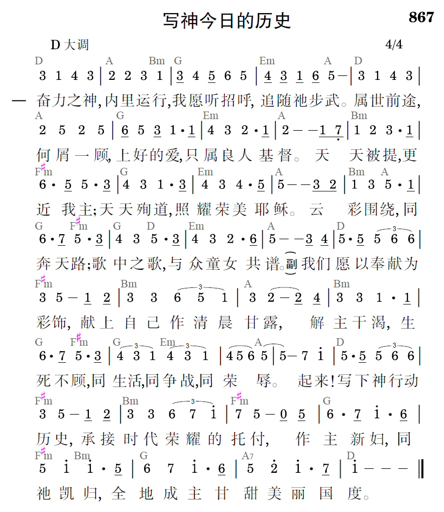 奋力之神,内里运行,我愿听招呼,追随祂步武。属世前途,何屑一顾,上好的爱,只属良人基督。天天被提,更近我主;天天殉道,照耀荣美耶稣。云彩围绕,同奔天路;歌中之歌,与众童女共谱。