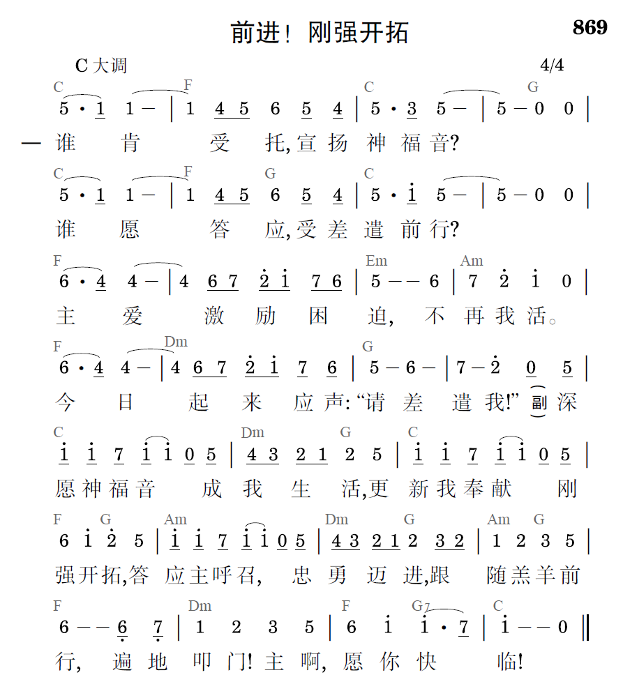 同作肢体,爱里相提携。同灵站住,同魂齐努力。只为基督身体,不顾自己。作主得胜新妇,时代转移。