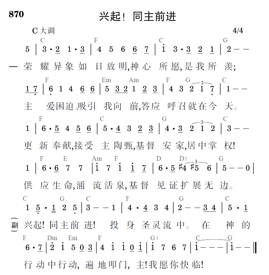 作主飞鹰,翱翔天际,在复活里,与祂是一;主话扩长,门徒化万民,国度福音,偏传地极。神的旨意,我荣耀定命:作得胜者,照神心意,圣城得建,国度实现,锡安山上同祂站立。