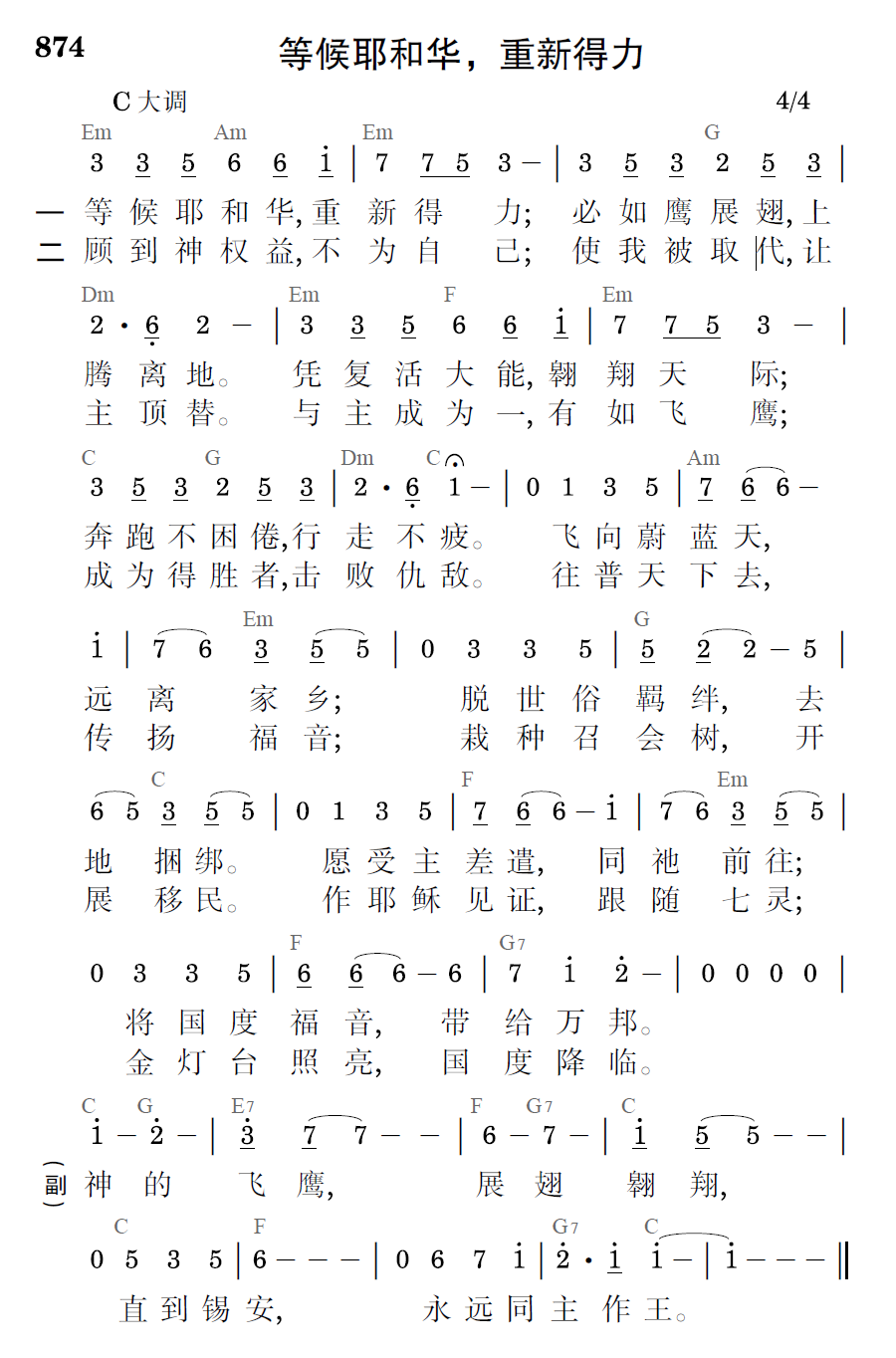 等候耶和华,重新得力;必如鹰展翅,上腾离地。凭复活大能,翱翔天际;奔跑不困倦,行走不疲。飞向蔚蓝天,远离家乡;脱世俗羁绊,去地捆绑。愿受主差遣,同祂往前;将国度福音,带给万邦。