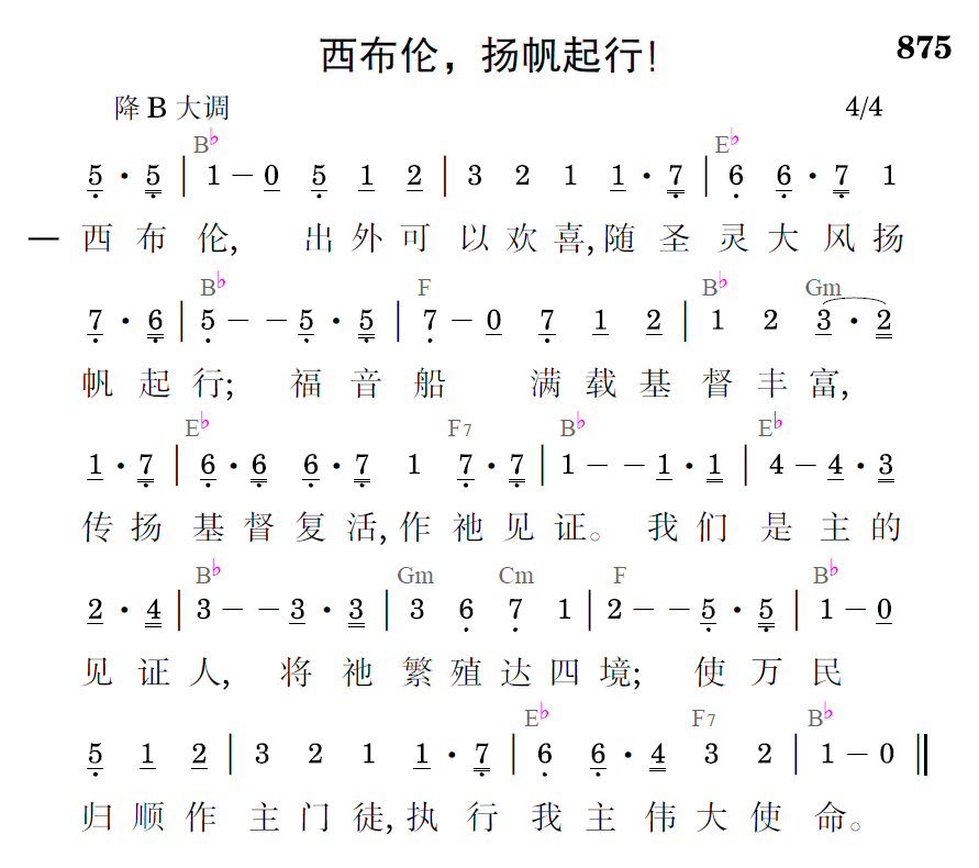 西布伦,出外可以欢喜,随圣灵大风扬帆起行;福音船满载基督丰富,传扬基督复活,作祂见证。我们是主的见证人,将祂繁殖达四境;使万民归顺作主门徒,执行我主伟大使命。