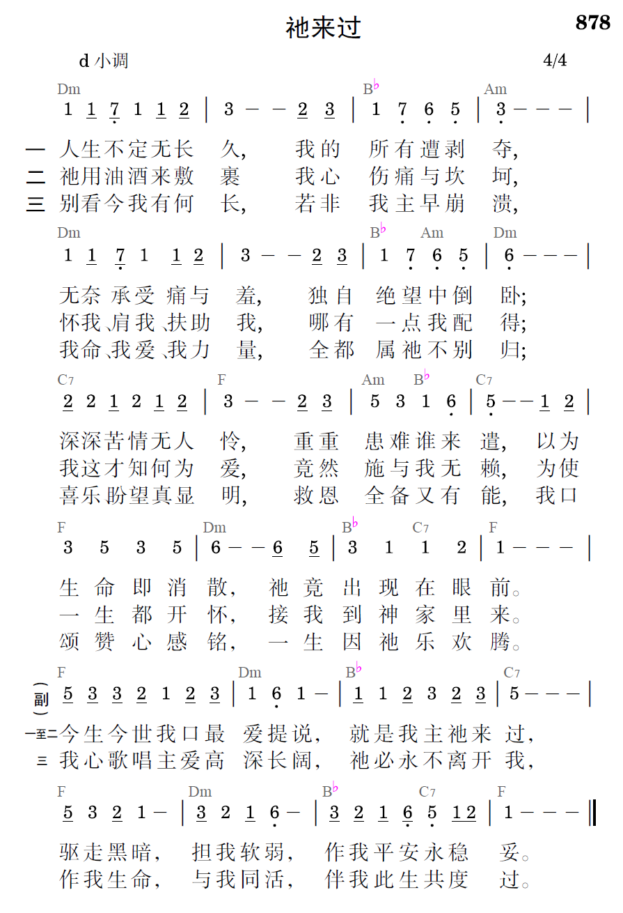 人生不定无长久,我的所有遭剥夺,无奈承受痛与羞,独自绝望中倒卧;深深苦情无人怜,重重患难谁来遣,以为生命即消散,祂竟出现在眼前。