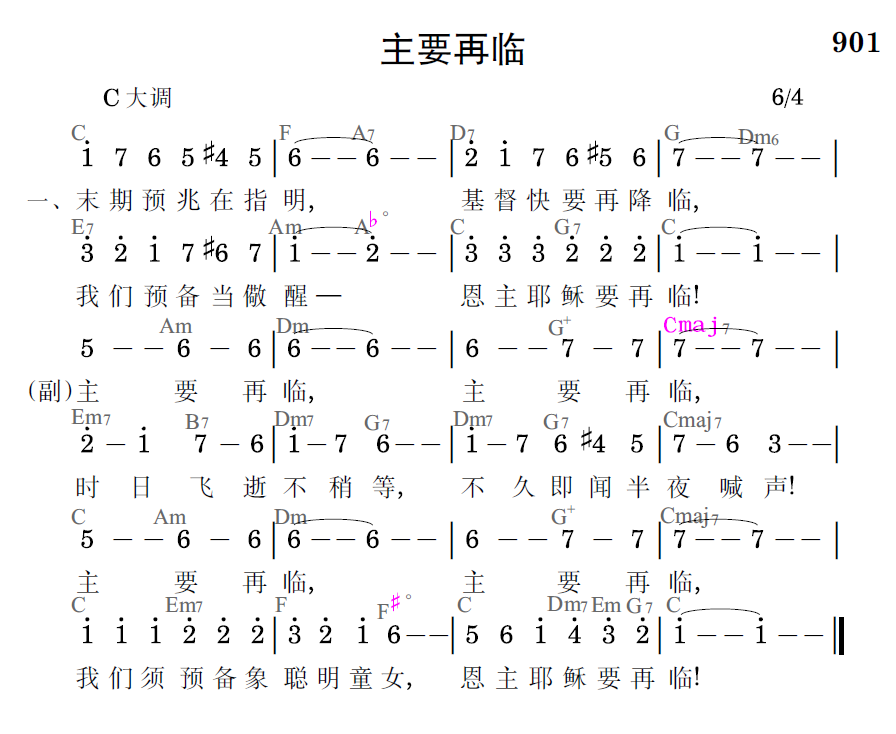主要再临,主要再临,时间飞逝不稍等,不久即闻半夜喊声!主要再临,主要再临,我们须预备像聪明童女,恩主耶稣要再临!
