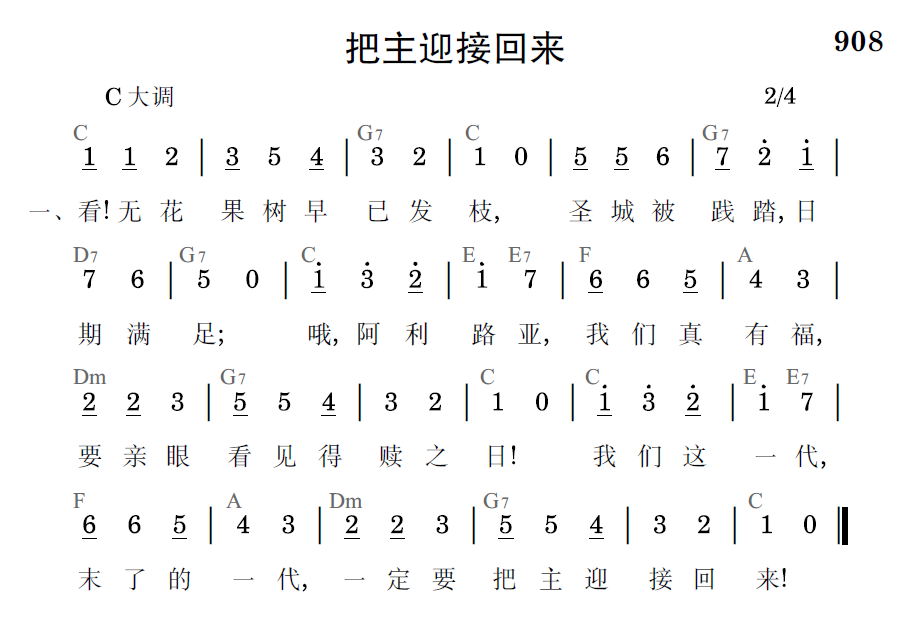 看!无花果树早已发枝,圣城被践踏,日期满足;哦,阿利路亚,我们真有福,要亲眼看见得赎之日!我们这一代,末了的一代,一定要把主迎接回来!
