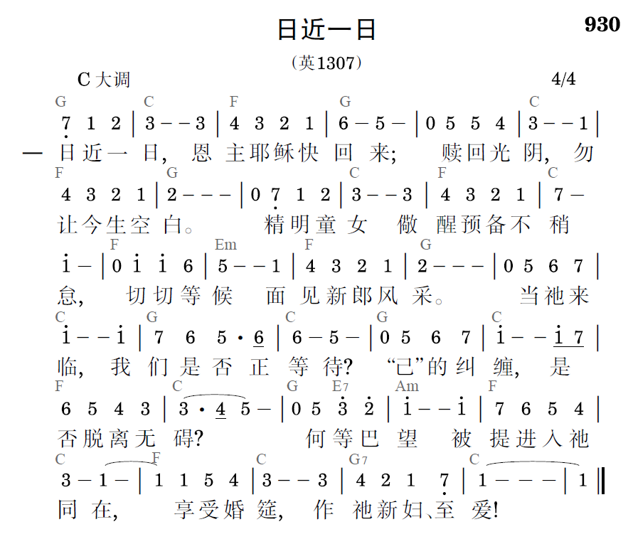 主,转我们,属魂享乐不留恋,唯注视你温柔、美丽荣脸。保守我们,奔跑赛程不困倦,忍耐到底,直至见你显现。当主来临,能否被提到祂前?能否见祂,坐席享受婚筵?应当儆醒,无一刻松懒随便;朝思暮想,唯盼新郎归旋。
