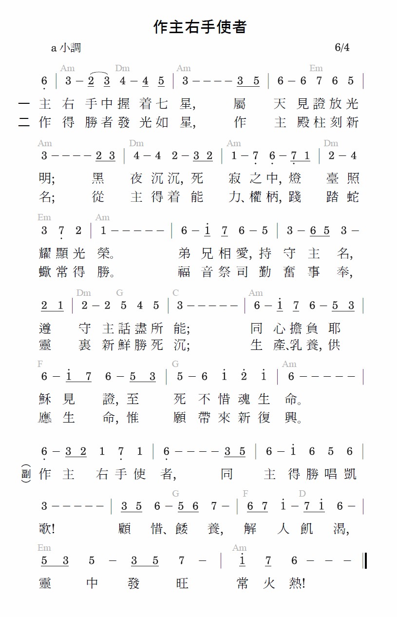 主右手中握着七星,属天见证放光明;黑夜沉沉,死寂之中,灯台照耀显光荣。弟兄相爱,持守主名,遵守主话尽所能;同心担负耶稣见证,至死不惜魂生命。