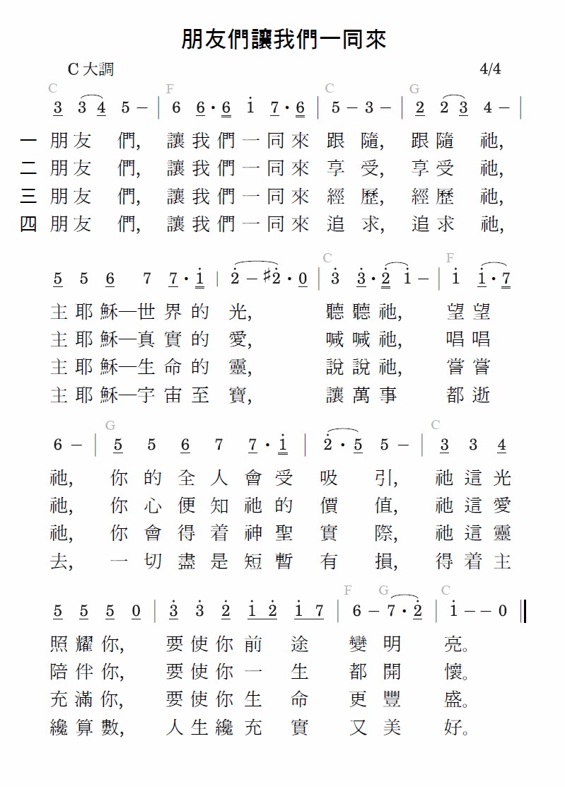 朋友们,让我们一同来跟随,跟随祂,主耶稣—世界的光,听听祂,望望祂,你的全人会受吸引,祂这光照耀你,要使你前途变明亮。