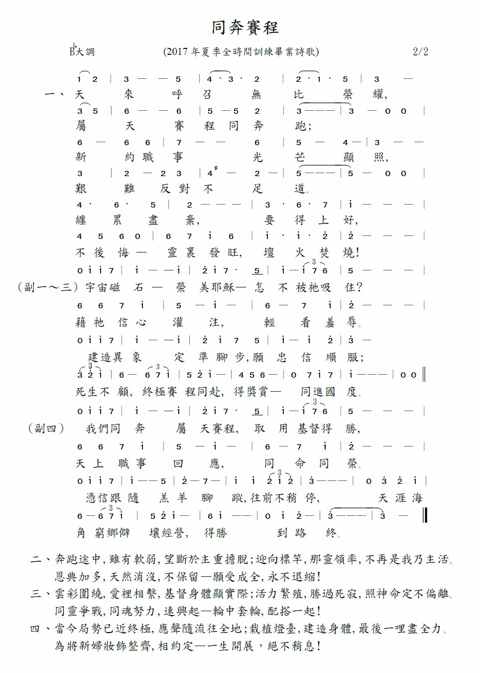 我们同奔属天赛程,取用基督得胜,天上职事回应,同命同荣。凭信跟随羔羊脚踪,往前不稍停,天涯海角、穷乡僻壤经营,得胜到路终。