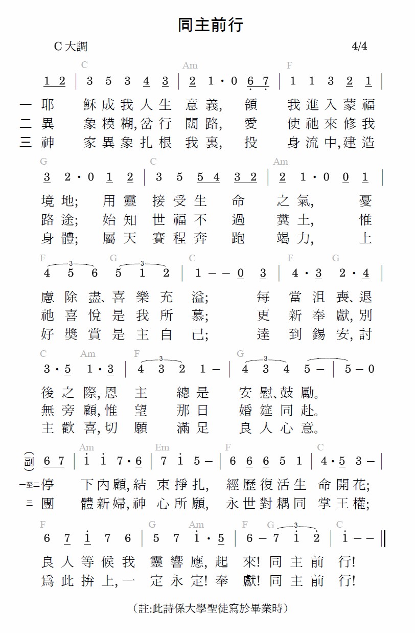 异象模糊,岔行阔路,爱使祂来修我路途;始知世福不过粪土,惟祂喜悦是我所慕;更新奉献,别无旁顾,惟望那日婚筵同赴。
