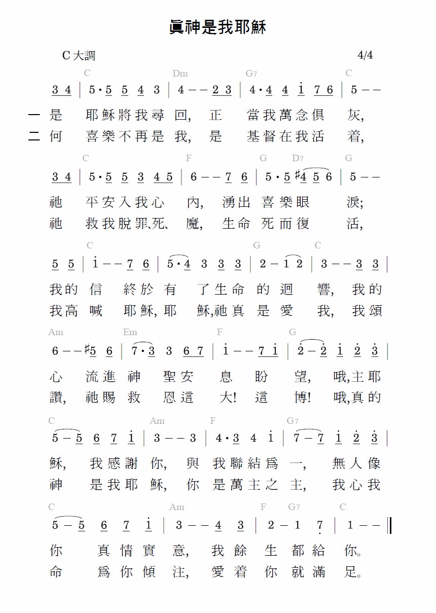 何喜乐不再是我,是基督在我活着,祂救我脱罪、死、魔,生命死而复活,我高喊耶稣,耶稣,祂真是爱我,我颂赞,祂赐救恩这大!这博!哦,真的神是我耶稣,你是万主之主,我心我命为你倾注,爱着你就满足。