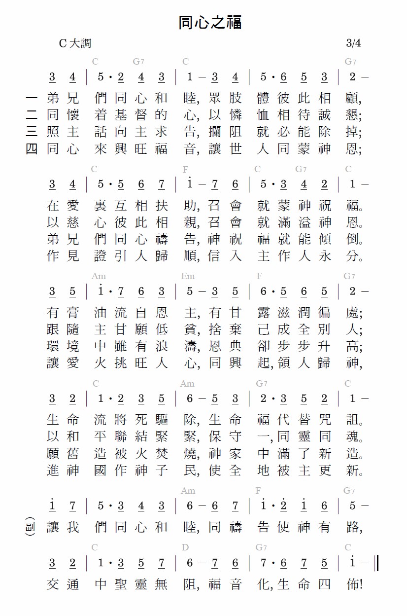 同心来兴旺福音,让世人同蒙神恩;作见证引人归顺,信入主作人永分。让爱火挑旺人心,同兴起,领人归神,进神国作神子民,使全地被主更新。