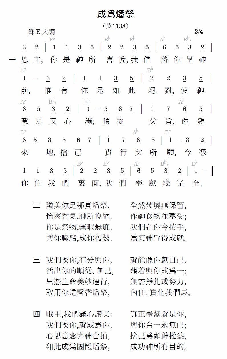 赞美你是那真燔祭,全然焚烧无保留,怡爽香气,神所悦纳,作神食物并享受;你是祭物,无瑕无疵,我们在你今按手,与你联结,成你复制,为使神旨得成就。