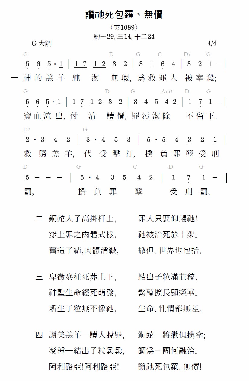 赞美羔羊—赎人脱罪,铜蛇—将撒但擒拿;麦种—结出子粒累累,调为一团何融洽。阿利路亚!阿利路亚!赞祂死包罗、无价!