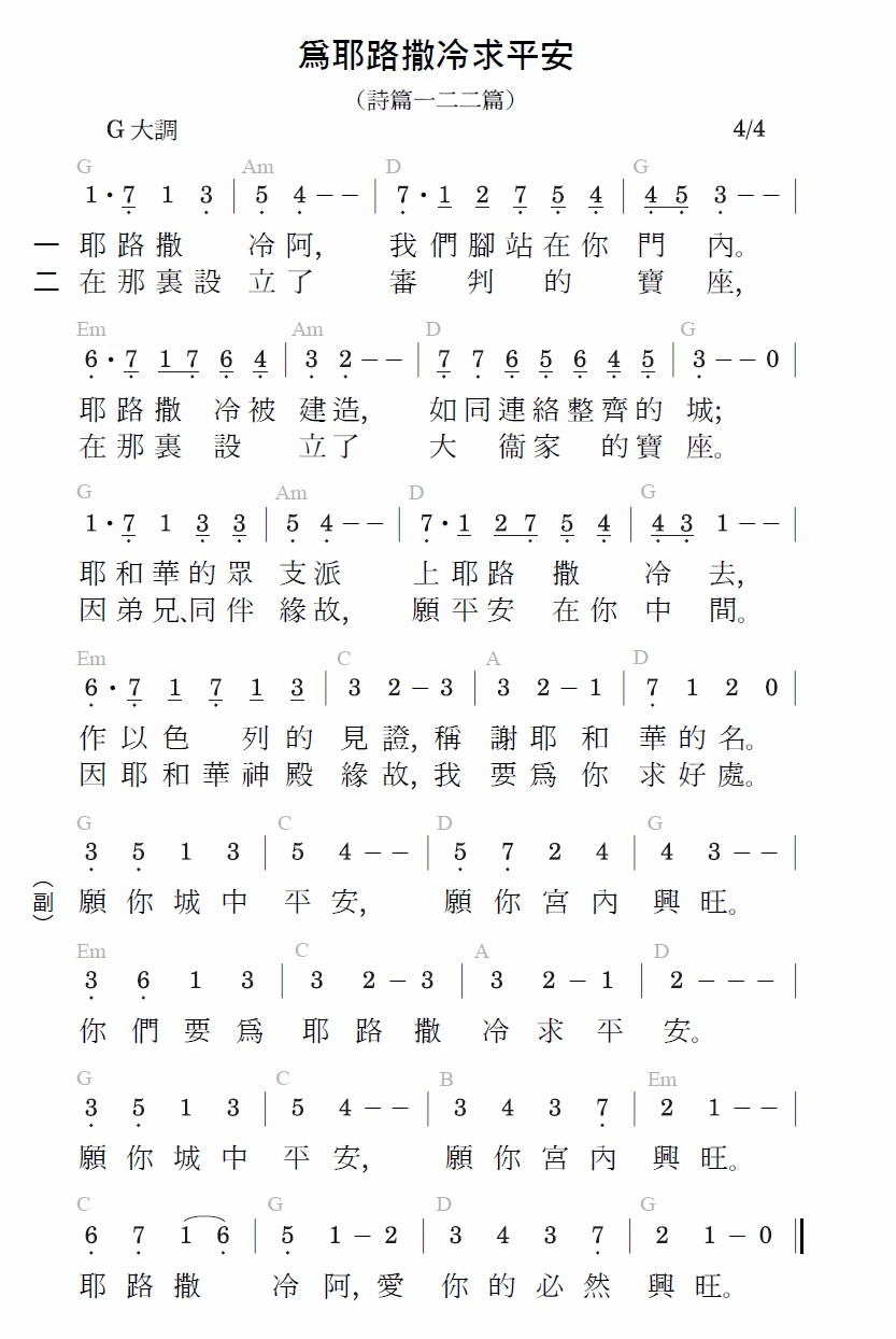 愿你城中平安,愿你宫内兴旺。你们要为耶路撒冷求平安。愿你城中平安,愿你宫内兴旺。耶路撒冷啊,爱你的必然兴旺。