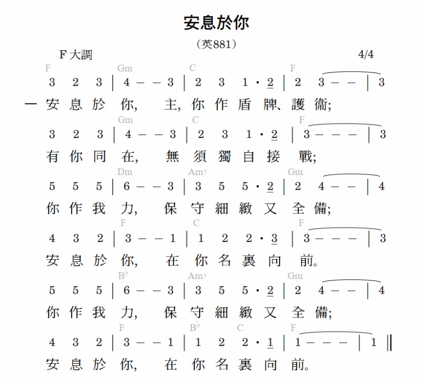 安息于你,主,你作盾牌、护卫;有你同在,无须独自接战;你作我力,保守细致又全备;安息于你,在你名里向前。你作我力,保守细致又全备;安息于你,在你名里向前。