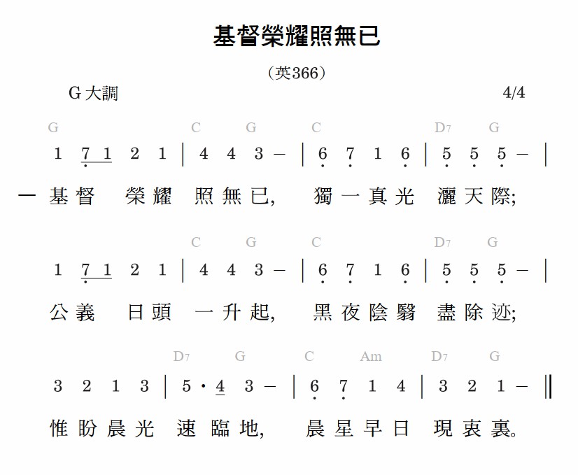 基督荣耀照无已,独一真光洒天际;公义日头一升起,黑夜阴翳尽除迹;惟盼晨光速临地,晨星早日现衷里。