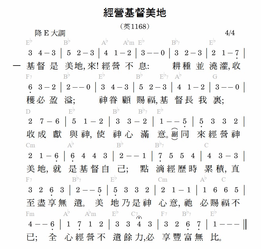 基督是美地,来!经营不息:耕种并浇灌,收获必盈溢;神眷顾赐福,基督长我里;收成献与神,使神心满意。