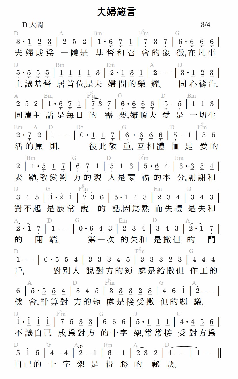夫妇成为一体是基督和召会的象征,在凡事上让基督居首位,是夫妇间的荣耀。同心祷告、同读主话是每日的需要,妇顺夫爱是一切生活的原则,彼此敬重、互相体恤是爱的表显,敬爱对方的亲人是蒙福的本分。谢谢和对不起是该常说的话,因为熟而失礼是失和的开端。第一次的失和是撒但的门户,对别人说对方的短处是给撒但作工的机会,计算对方的短处是接受撒但的提议,不让自己成为对方的十字架,常常接受对方为自己的十字架是得胜的秘诀。